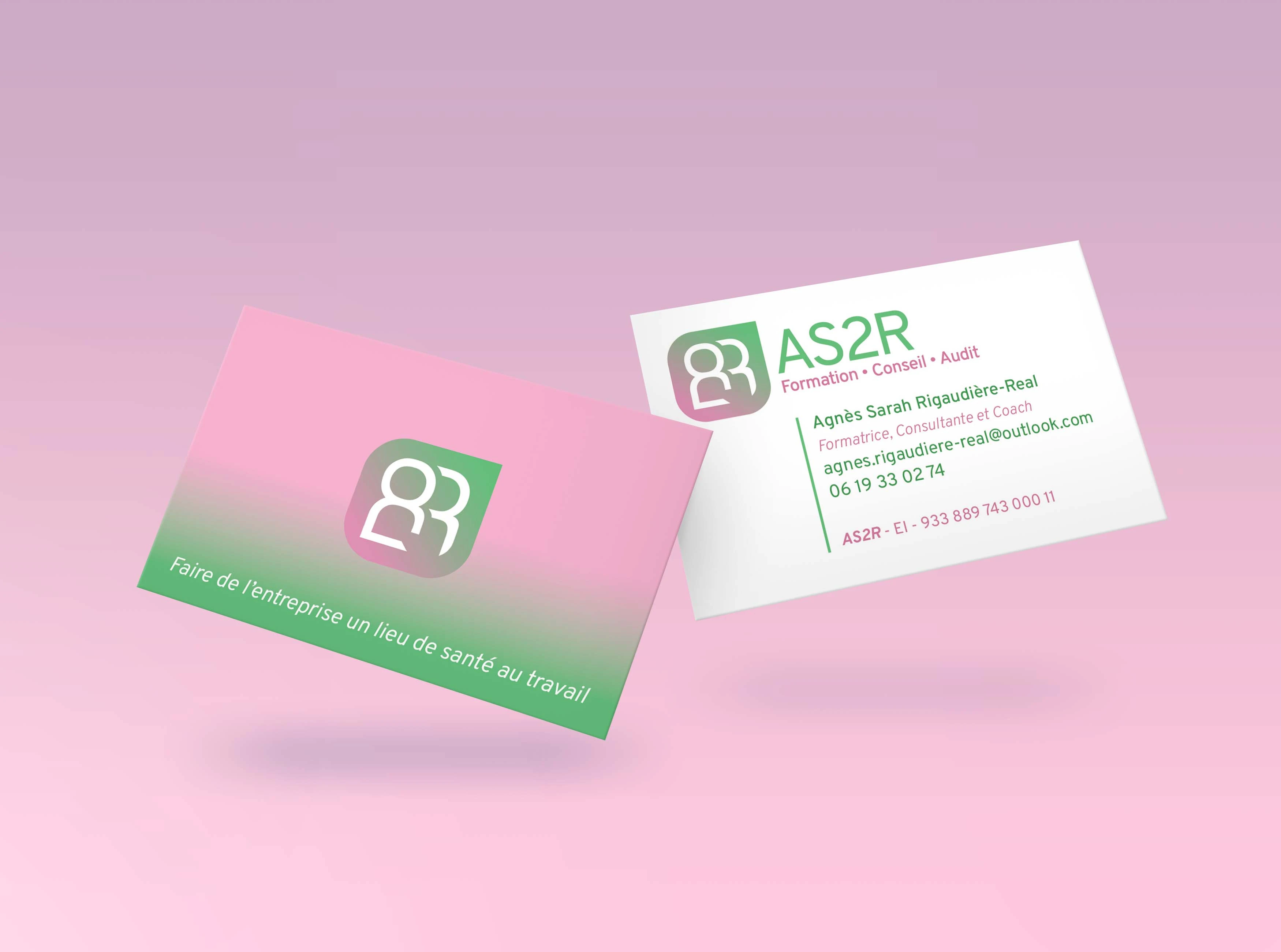 Le logotype, à la fois jeu typographique reprenant les initiales de l'entreprise et pictogramme évoquant le geste d'entraide, se pare d'une alliance de rose et de vert clair : la quête du bien-être au travail s'assortit de la prévention et d'encadrement.