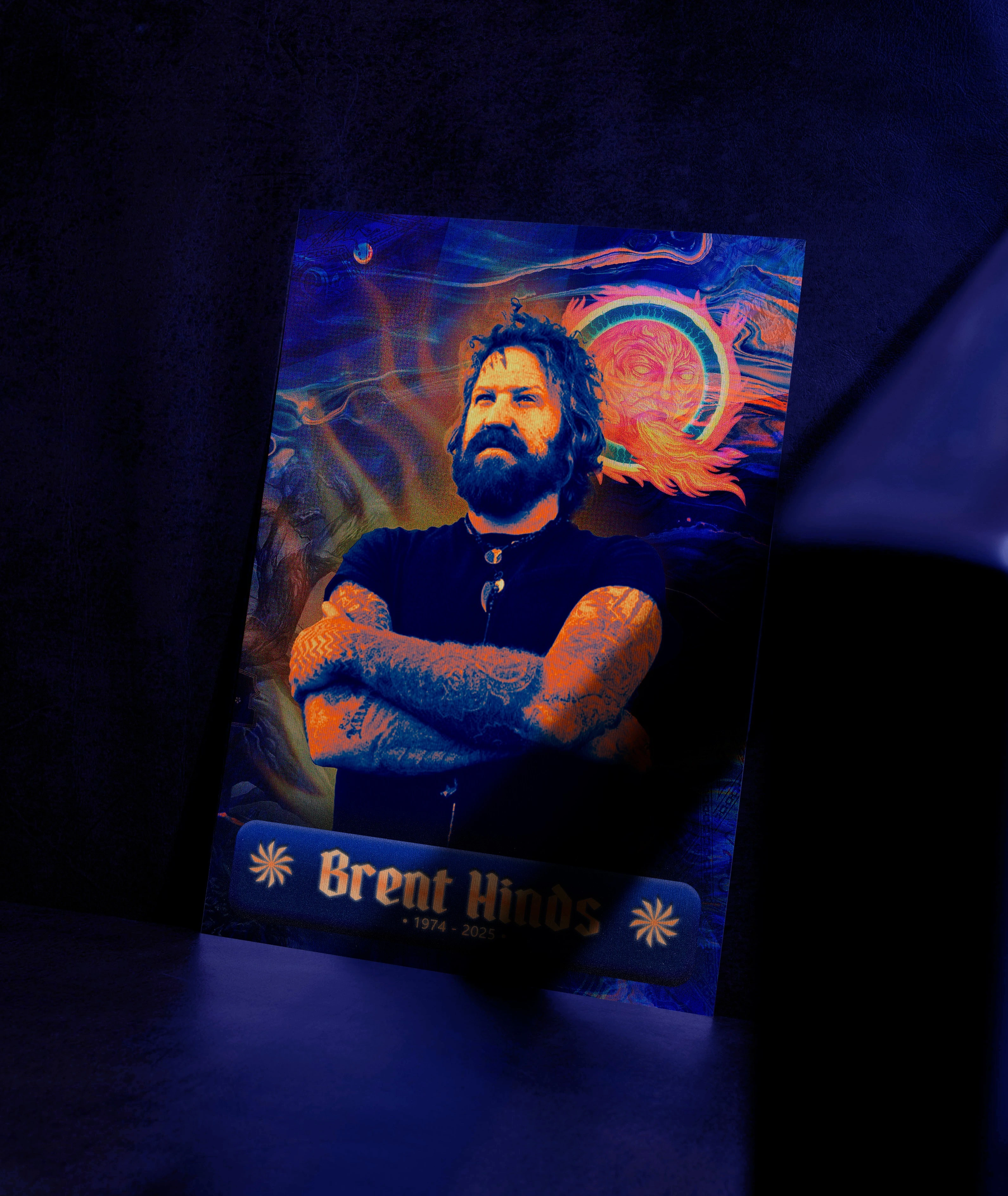 Poster hommage à Brent Hinds, cofondateur et ex-guitariste du groupe de sludge metal américain Mastodon, décédé en 2025.